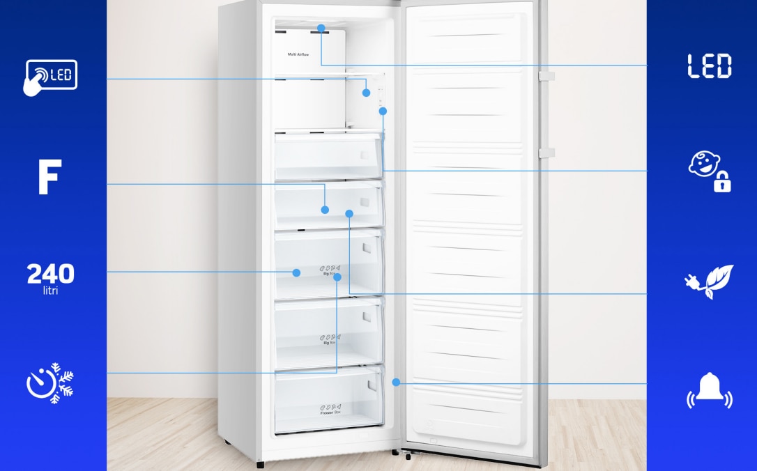 Sistem Multi Air Flow Acest sistem are grija ca aerul rece sa se extinda rapid si uniform, mai eficient decat sistemul traditional de ventilare, pentru ca alimentele sa ramana proaspete timp indelungat. | ![]() |