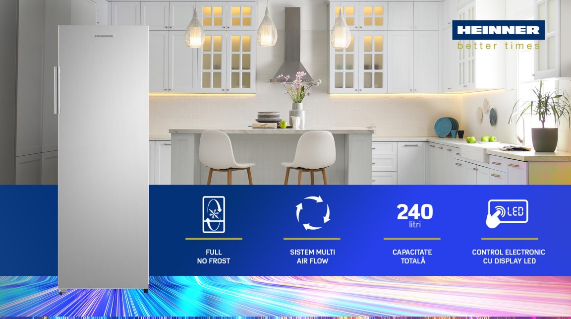 Congelator Heinner HFF-240NFXF+, 240 l, 5 sertare + 2 compartimente, Full No Frost, Clasa F, Multi air flow, Display interior LED, Control electronic, Argintiu | |