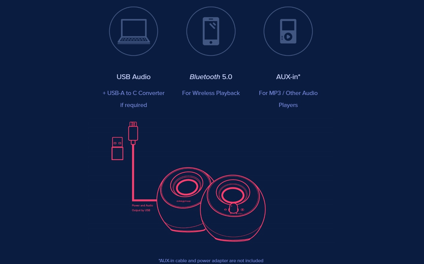 Si acolo unde versatilitatea intalneste flexibilitatea, Creative Pebble V3 poate fi alimentat prin USB-C sau cu un adaptor de alimentare si poate fi configurat prin diverse optiuni de conectivitate! De asemenea, are o mufa AUX-in de 3,5 mm care permite compatibilitatea universala cu alte dispozitive audio analogice.