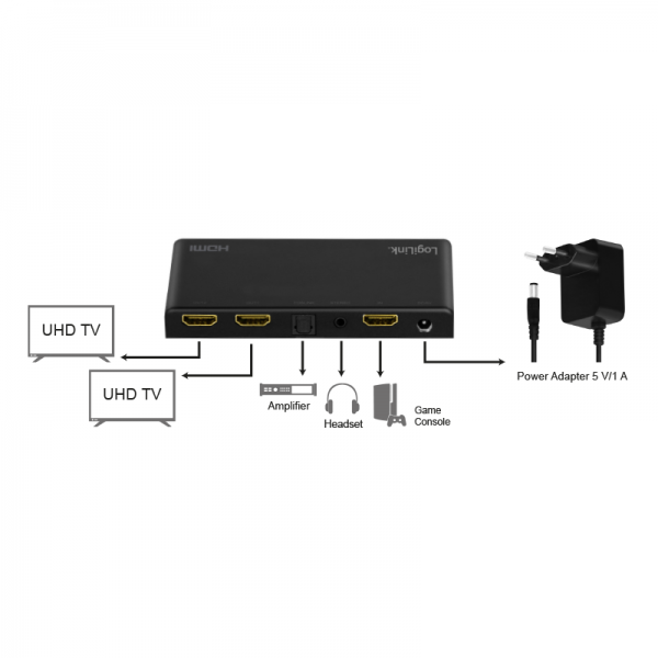 SPLITTER video LOGILINK, 1 x 2 port, Input: HDMI (M) x 1, Output: HDMI (M) 2.0 x 2, rezolutie maxima 4K UHD (3840 x 2160) la 60 Hz, HDCP 2.2, EDID, audio, negru, "HD0034" (timbru verde 0.8 lei)