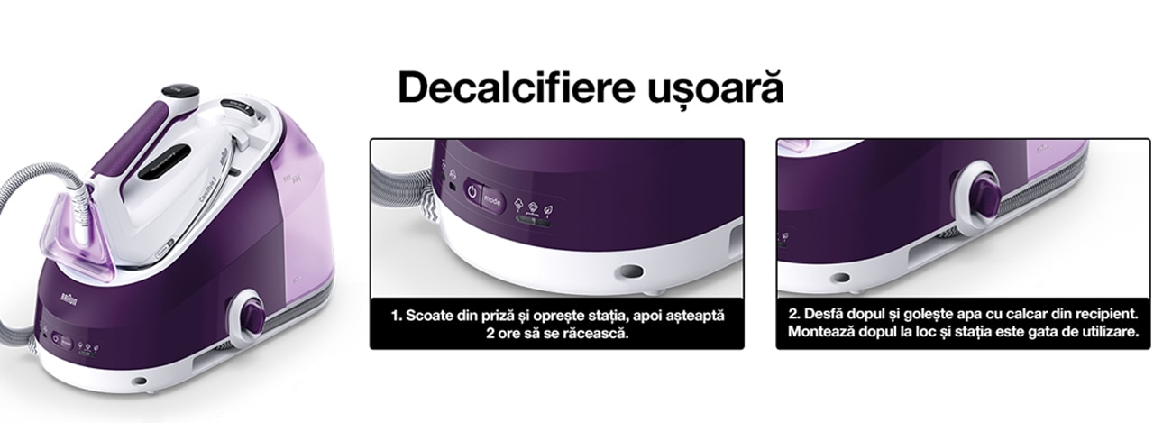 Proiectat pentru a proteja statia de calcat si a-i prelungi durata de viata, sistemul de curatare este ultra rapid si usor de realizat. Ultimate FastClean colecteaza calcarul si anunta cand recipientul trebuie golit, astfel, tot ce trebuie sa faci este sa scoti dopul si sa golesti apa si particulele de calcar.