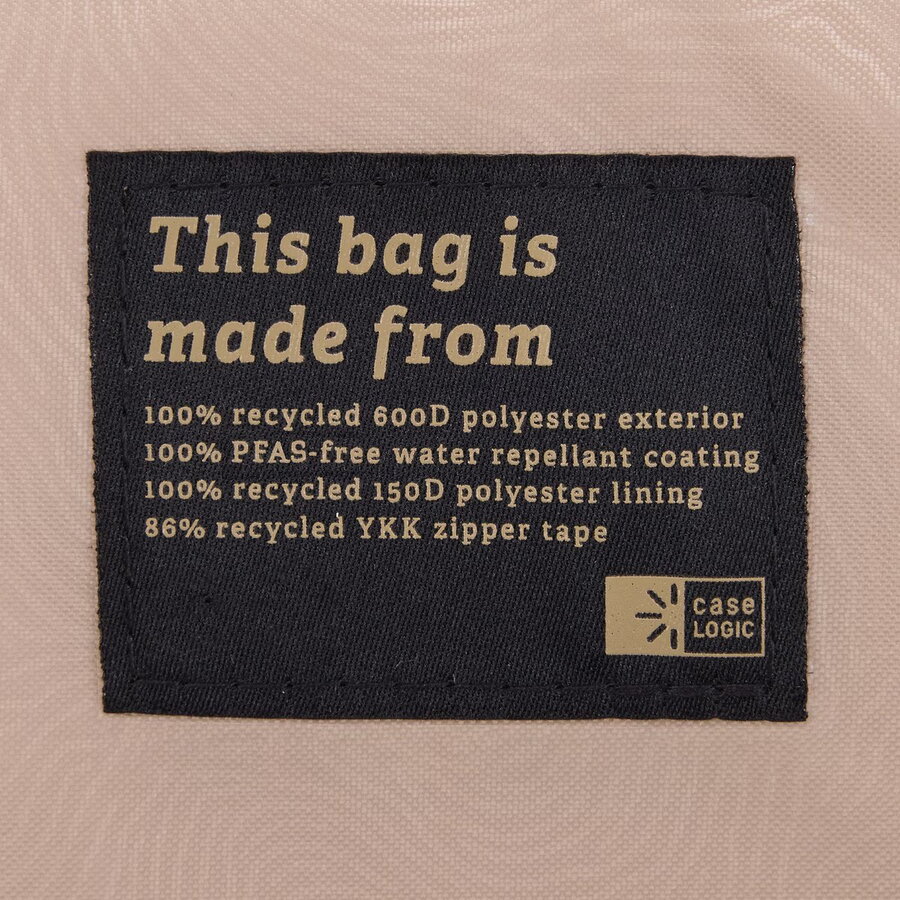 This bag is made with a 100% recycled 600D polyester exterior, 150D polyester lining, PP webbing, and 86% recycled YKK zipper tape. The water-repellent coating is also free from PFCs, chemicals that are harmful to the environment