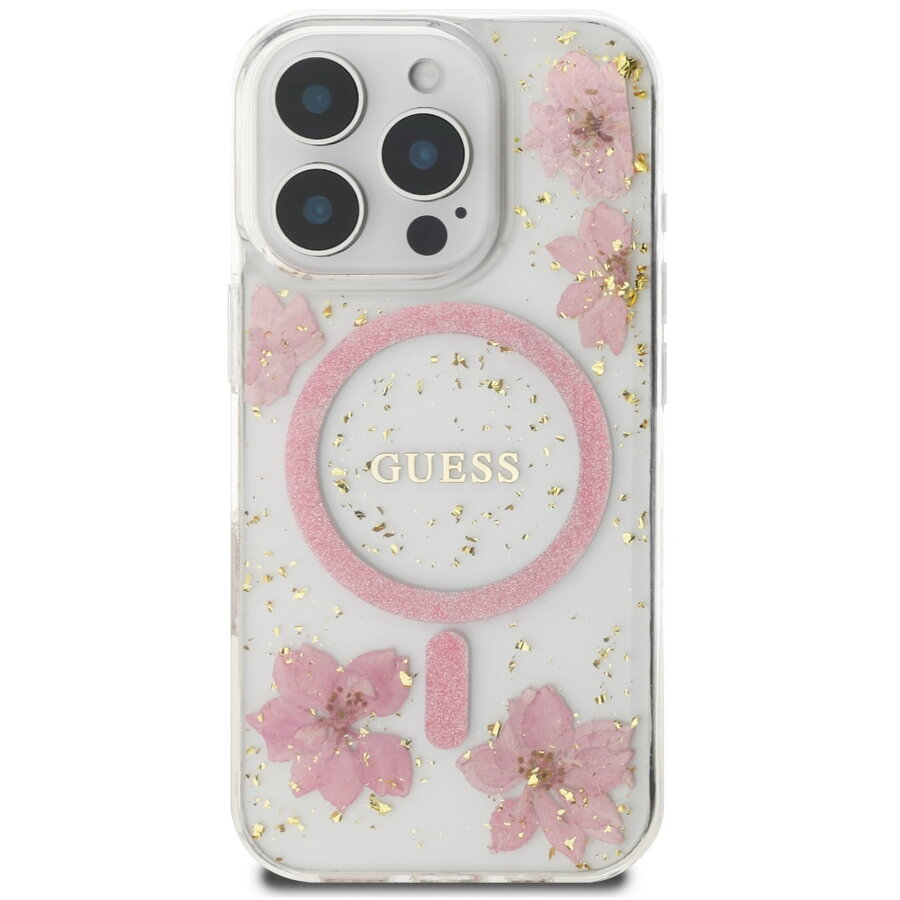 Husa Husa pentru iPhone 16 Pro Max - Guess  Hardcase Resin Flowers and Glitter MagSafe (GUHMP16XRBFGFGMP) - Pink