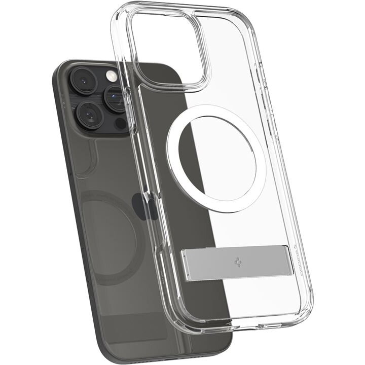 Spigen Ultra Hybrid S MagSafe caseBuilt-in magnetic ring for MagSafe functionHybrid design made of rigid back and flexible bumperRaised bezels lift screen and camera off flat surfacesMil-grade certified with Air Cushion TechnologyPrecise cutouts and tactile buttons ensure quick access and feedbackEffortless viewing anywhere with a built-in standWireless charging and MagSafe compatibleMaterial: TPU + PC