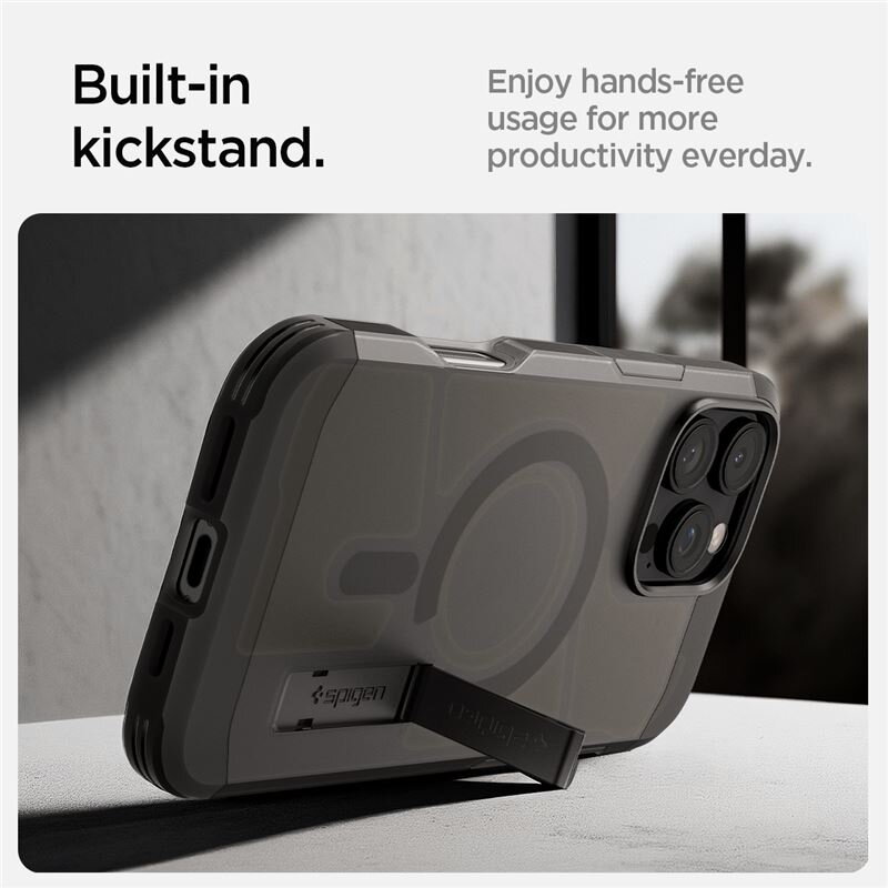 Spigen Tough Armor MagSafe caseBuilt-in magnetic ring for MagSafe function functionExtreme dual-layer protection made of a TPU body and PC backRaised bezels lift screen and camera off flat surfacesMil-grade certified with Air Cushion TechnologyPrecise cutouts and tactile buttons ensure quick access and feedbackEffortless viewing anywhere with a built-in standWireless and MagSafe charging compatibleMaterial: TPU + PC