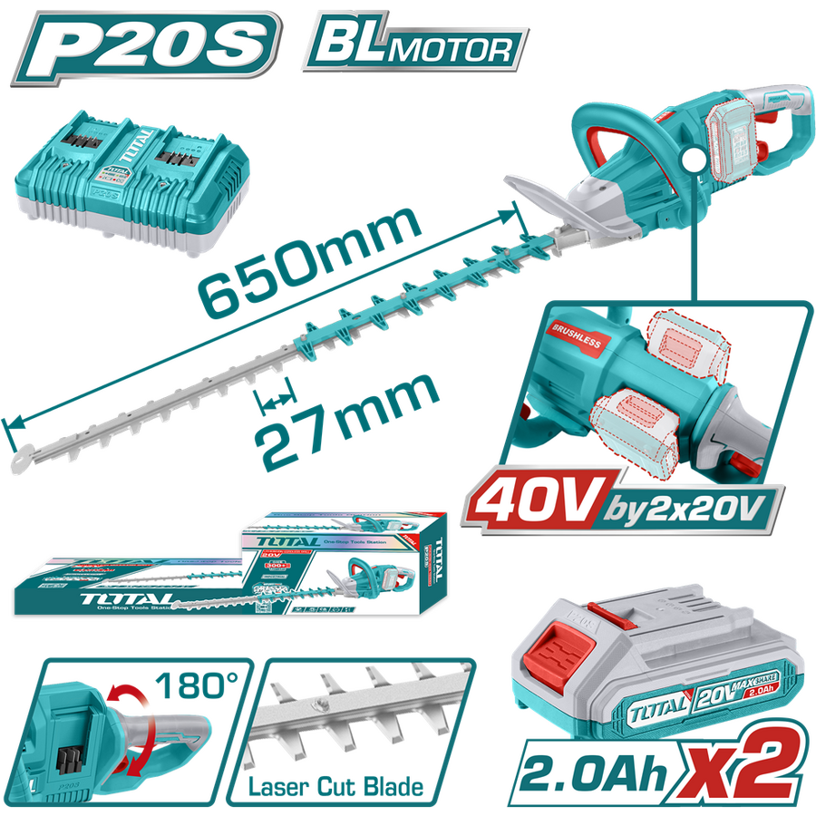 Trimmerul pentru tuns gard viu TOTAL, alimentat de o baterie Li-Ion de 40V, este proiectat pentru a oferi performante superioare si comoditate in intretinerea gardurilor vii si a arbustilor. Setul include atat acumulatorul, cat si incarcatorul, asigurand tot ce este necesar pentru a incepe lucrul imediat.