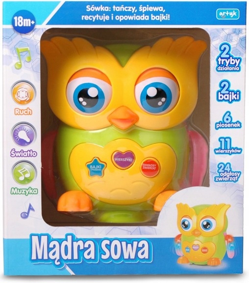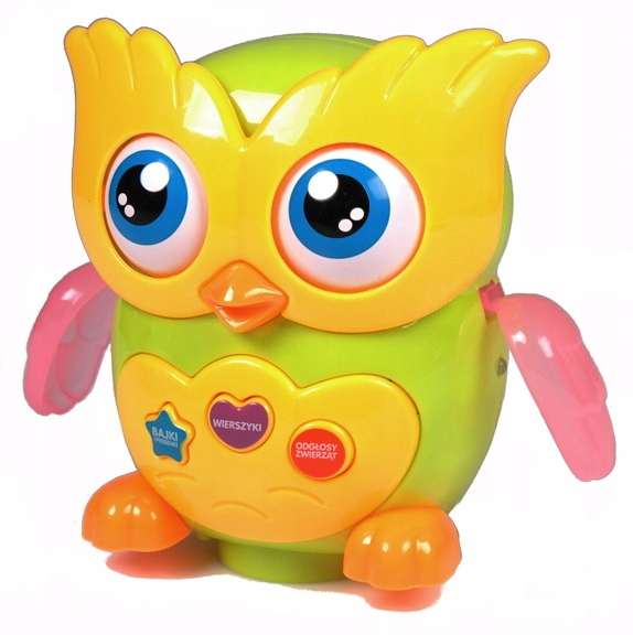 E-EDU EDUCATIONAL WISE OWL Bufnita inteleapta E-EDU este o jucarie grozava pentru cei mai tineri. In timpul jocului, isi va misca aripile, care intr-unul dintre moduri vor incepe sa straluceasca in culori diferite. 2 moduri de operare: se va incanta cu poezii si basme sau cu miscarea si cantarea sa! Bufnita este o jucarie care stimuleaza dezvoltarea vederii, auzului si vorbirii, precum si a inteligentei emotionale si a sensibilitatii copilului. De asemenea, ii incurajeaza sa fie activi si sa se distreze impreuna. Onomatopeele dezvolta vorbirea bebelusului si, datorita poeziei amuzante si basmelor cu o morala, ii permit sa-si extinda cunostintele. Caracteristicile jucariei: