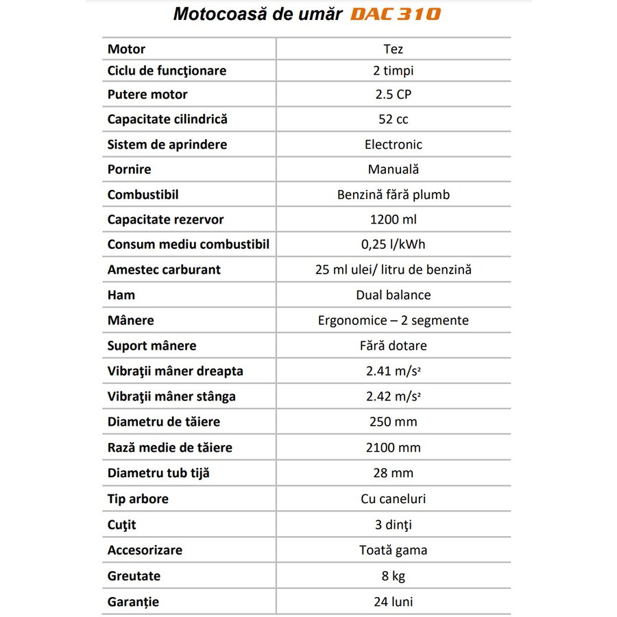 Motocoasa Ruris DAC 310, 2.5 CP, Motor TEZ, 2 timpi, 200 mm, este alegerea perfectă făcută de către oricare utilizator, care isi doreşte o motocoasă de putere medie la un preţ excelent în raport cu puterea pe care o poate oferi motocoasa DAC 310.