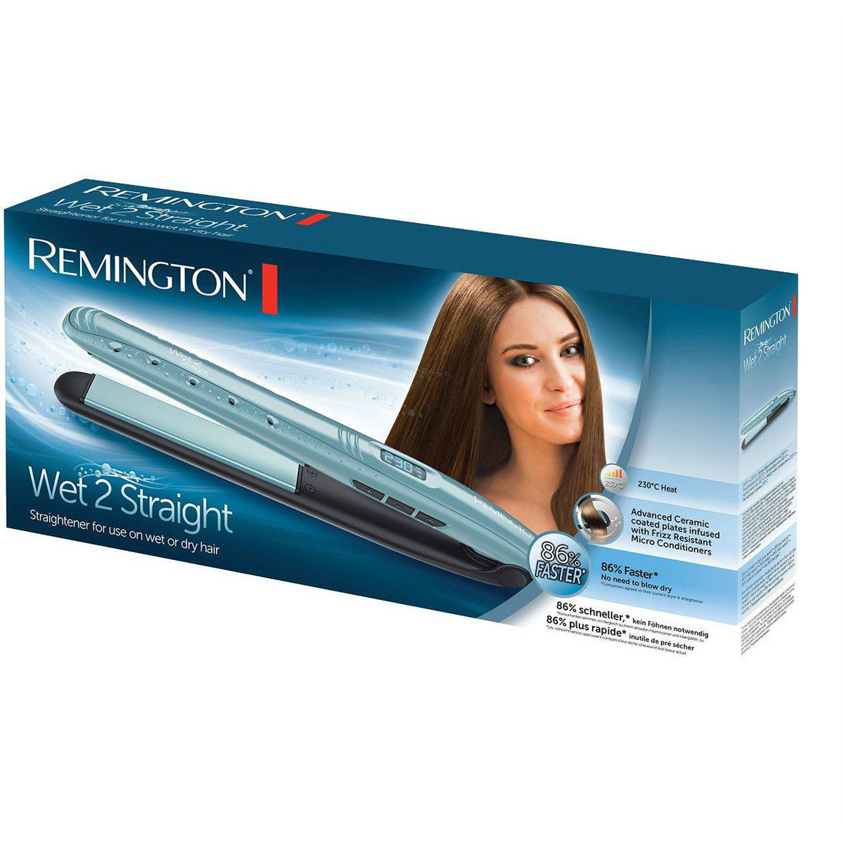 Wet2Straight de la Remington este un aparat esențial pentru rutina ta zilnică. Această placă de îndreptat părul te va ajuta să îți optimizezi rutina de dimineață, ajutându-te să economisești timp și energie. Concepută special pentru a fi utilizată pe părul uscat doar cu prosopul, această placă îți oferă libertatea de a elimina rutina de uscare a părului cu un uscător, Wet2Straight uscându-ți și îndeptăndu-ți părul în același timp, astfel ajutându-te să obții un păr drept cu până la 86% mai rapid decât cu o rutină normală*. E simplu - în timp ce aplici plăcile pe părul uscat cu prosopul, apa în exces se evaporă prin orificiile special concepute, uscând și îndreptând părul în același timp. Plăcile flexibile de 110mm aplică o presiune uniformă pe toată lungimea părului, ajutându-te să obții rezultate profesionale, iar timpul de încălzire scurt te va ajuta să economisești timp în momentele în care te grăbești. Wet2Straight de la Remington este singurul aparat de care ai nevoie pentru a obține un păr drept în cel mai scurt timp.