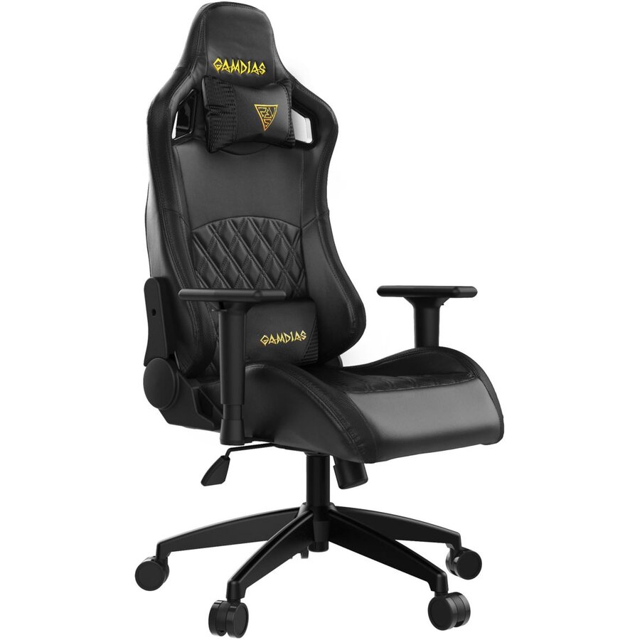 Scaun gaming Gamdias Aphrodite EF1L negru, permite diverse reglaje: inaltime, inclinare, rotire 360°, inaltime scaun: 127-137cm, inaltime sezut: 43-53cm, inaltime spatar: 84cm, latime spatar: 53cm, latime sezut: 53cm, adancime sezut: 56cm, material captuseala: Leather style Vynil, echipat cu piston cu gaz clasa 3, inclinare spatar: 150°, include penite pentru zona lombara si cea cervicala, greutate maxima suportata: 150kg, manere 2D