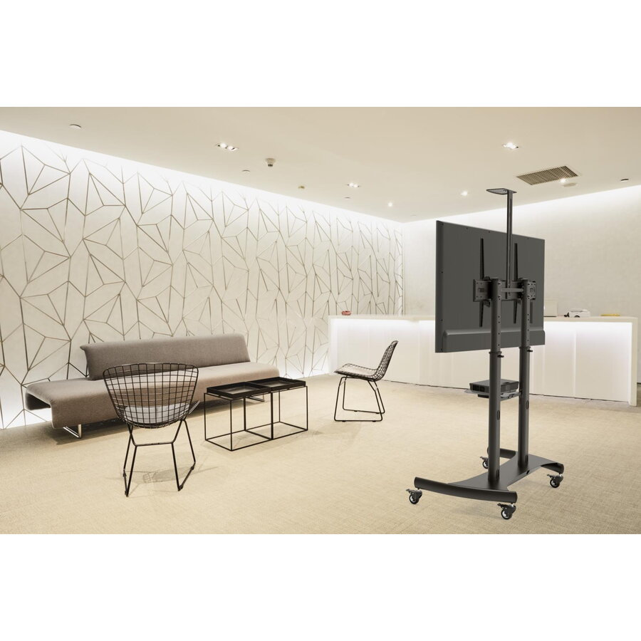Stand TV mobil Serioux TV610TW 60"-100", dimensiuni: 1220x710x2045~ 2365mm, compatibilitate dimensiune ecran: 60"-100", compatibilitate VESA: 400x400, 600x400, 800x400, 800x600, 900x600, 1000x600, Greutate maximă suportata: 100 kg, interval de înclinare: +5°~-10°, interval de înălțime: 1365~1685mm, greutate maximă suportata raft: 5 kg, greutate maximă suportata a suportului pentru cameră: 5 kg, inălțimea raftului reglabilă