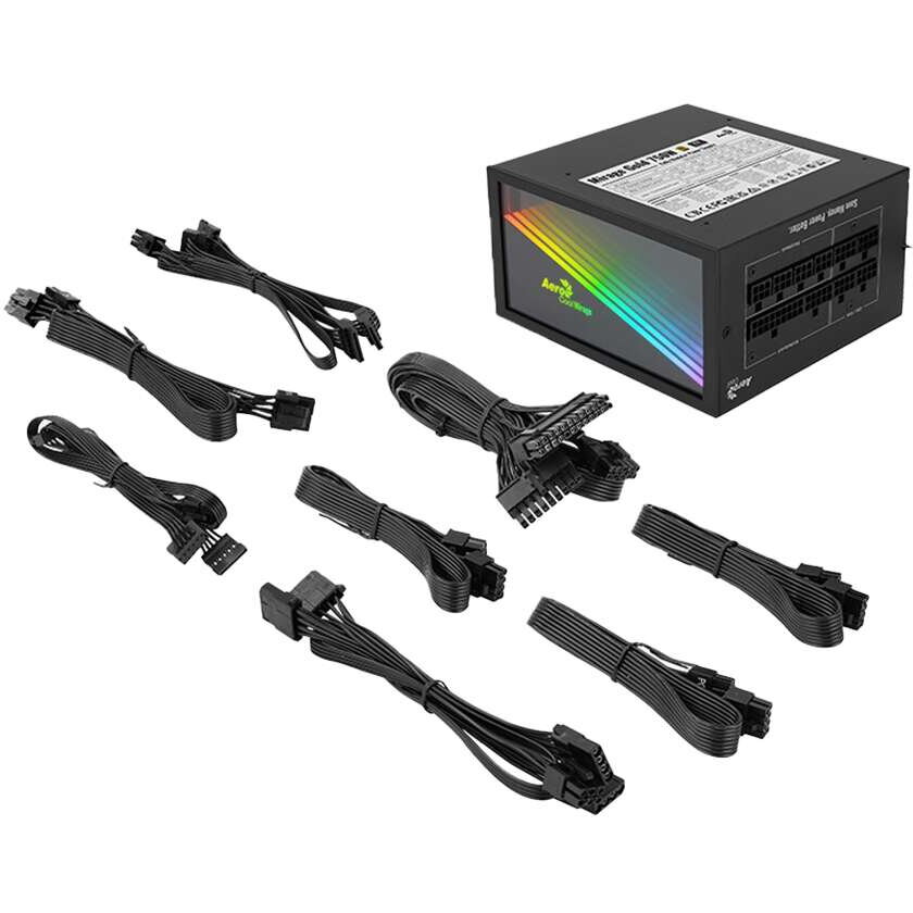 Sursa full modulara Aerocool Mirage Gold 750W neagra iluminare aRGB, certificata 80 PLUS Gold eficienta 90%, iluminare aRGB, single rail (62A), ventilator silentios de 120mm cu control termic automat, 3x 6+2pin PCIE, 8x SATA, 4x Molex, 2x 4+4pin EPS12V (lungime 550mm), 1x 24pin (lungime 600mm), protectii OVP/UVP/OPP/SCP/OCP, Active PFC, ATX 12V v2.52