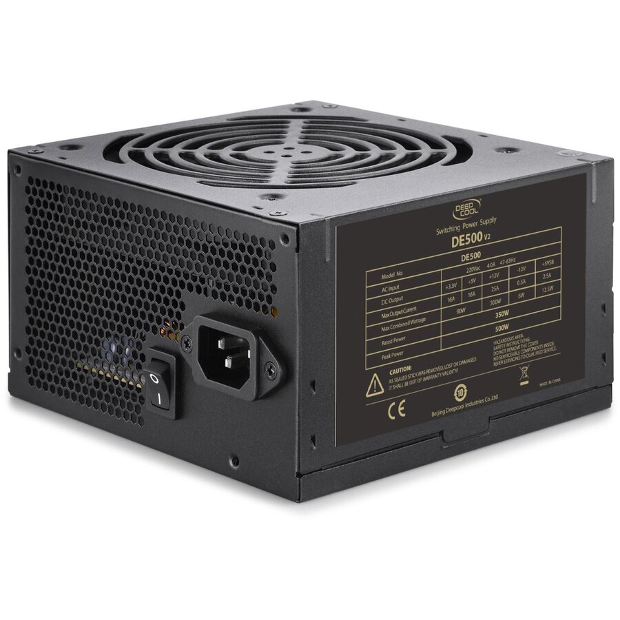 Sursa Deepcool DE500 V2 500W, 350W output, 500W peak load, single rail (25A), ventilator silentios de 120mm cu control termic automat, 1x 6+2pin PCIE, 4x SATA, 3x Molex, 1x EPS 4+4pin(600mm)1x 24pin, protectii OVP / UVP / SCP / OPP, ATX 12V v2.31, dimensiuni (WxLxH): 150x140x86mm