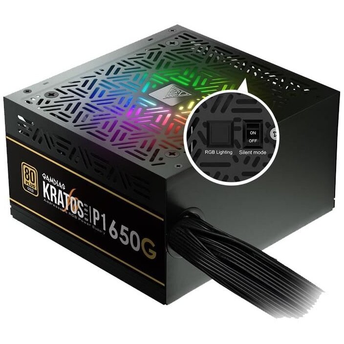 Sursa Gamdias Kratos P1 650W iluminare RGB, certificata 80 PLUS Gold, single rail (54.2A), ventilator silentios de 120mm cu control termic automat(se poate activa/dezactiva din buton) cu iluminare adresabila RGB, cabluri plate pentru un wire management mai bun, buton pentru pornire/oprire mod silentios (cand modul silentios este activat, ventilatorul isi regleaza viteza in functie de temperatura din interiorul sursei), 2x 6+2pin PCIE, 6x SATA, 3x Molex, 1x Floppy, 1x 4+4pin EPS12V, 1x 20+4pin, OVP/UVP/OPP/OCP/SCP/SP/ICP, Active PFC, dimensiuni: 86mmx150mmx140mm