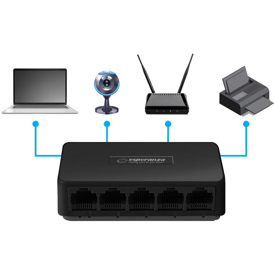 5-port desktop switch allows you to increase network speed. 5 ports 10/1000 Mb/s enable fast file transfer without generating interference. It is fully compatible with most network devices such as computers, printers, webcams and IPTV. Thanks to plug and play installation, connecting new devices takes only a few minutes. All ports support Auto-MDI/MDIX, so you don't have to waste time choosing the right cable. The device has many applications and is a great network solution that can be used in dormitories, monitored facilities, homes and small companies.