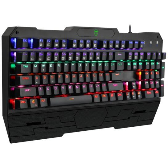 Tastatura gaming mecanica T-Dagger Battleship iluminare rainbow neagra, toate tastele fara conflict (n-key rollover), iluminare LED rainbow a tastelor (7 culori disponibile, 9 moduri de iluminare, reglarea intensitatii, posibilitatea iluminarii numai anumitor taste – 3 profile de iluminare), 6 taste multimedia, tasta WIN poate fi dezactivata in timpul jocurilor, taste durabile (double shot inject), conector USB placat cu aur, dimensiuni: 446.3x194.6x37.8mm