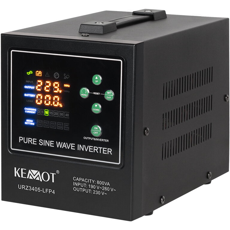 Putere nominala: 500 W Tip baterie: 12 V DC Tensiune maximă a bateriei: 15V DC Domeniu de tensiune de intrare: 190 - 260 V AC Frecventa de intrare: 45 - 60 Hz Domeniu de tensiune de ieșire: 190 - 245 VAC +/-5% / Invertor: 230 VAC +/-3% Frecventa de iesire: 50/60 Hz +/-0,5 Hz Forma tensiunii de ieșire: undă sinusoidală pură Eficiență de ieșire: >= 85% (DC la AC) Curent de încărcare a bateriei: max. 10A Capacitate baterie: 50-200 Ah (recomandat: 55 Ah) Timp de încărcare estimat: 4-14 ore (în funcție de capacitatea bateriei) Timp de comutare: =< 4 ms Protecții: Împotriva suprasarcinii, scurtcircuitului, tensiunii prea ridicate sau prea scăzute Temperatura de functionare admisa: 0 - 40°C Umiditatea aerului admisă: 10 - 90% Greutate: 4,7 kg Dimensiuni: 138 x 226 x 155 mm Parametrii bateriei recomandați: Tensiune baterie: 12V Gama de tensiune de încărcare: 13,9 V - 14,5 V (ciclu de încărcare) / 13,3 V - 13,9 V (încărcare lină) Pragul inferior al tensiunii bateriei: 10,5 V - 11,5 V (acid) / 10,9 V - 11,5 V (LiFePO4) Protecție la tensiune scăzută a bateriei: 9,8 V - 11 V (acid) / 10,6 V - 11 V (LiFePO4) Curent de încărcare: 3A / 5A / 10A
